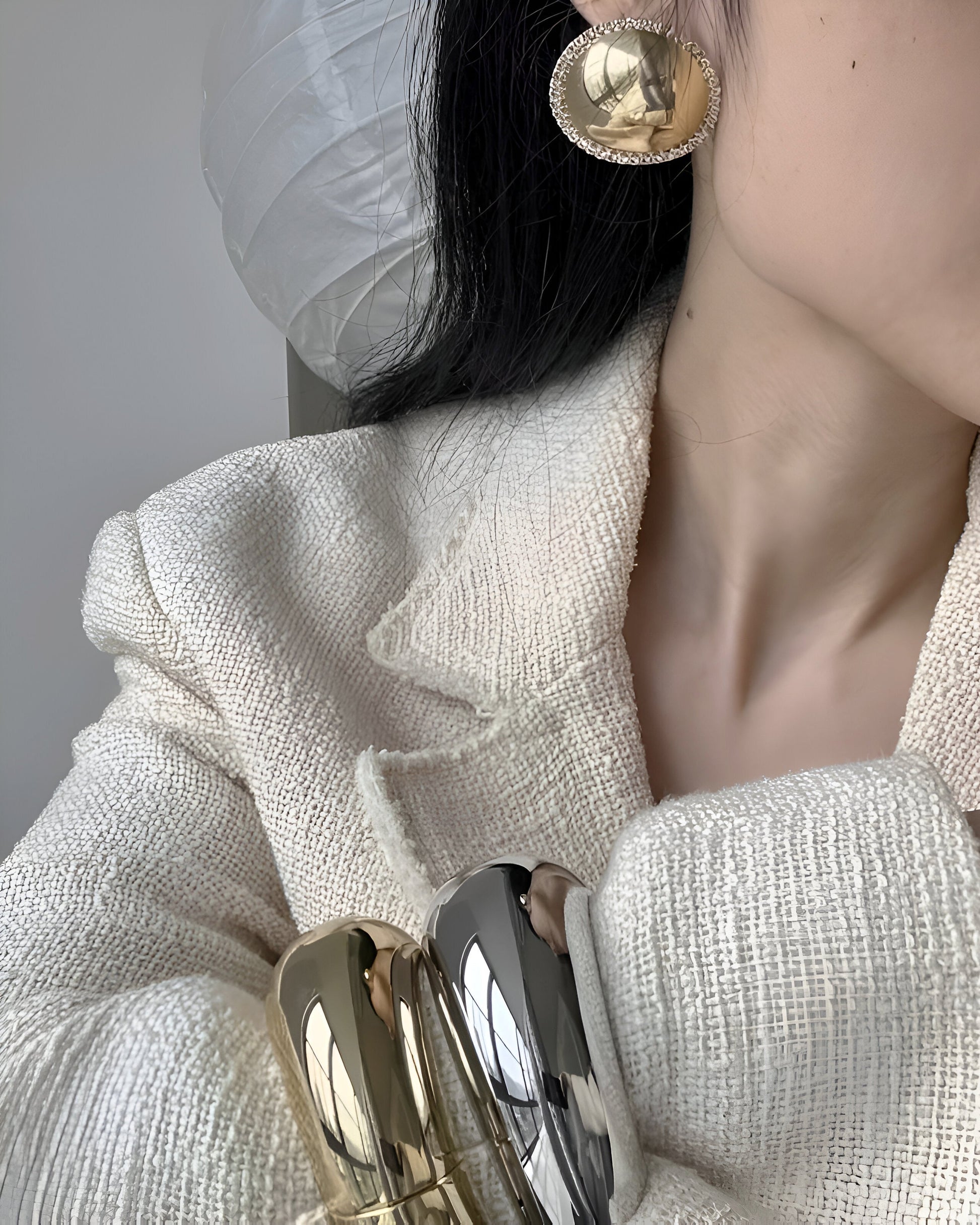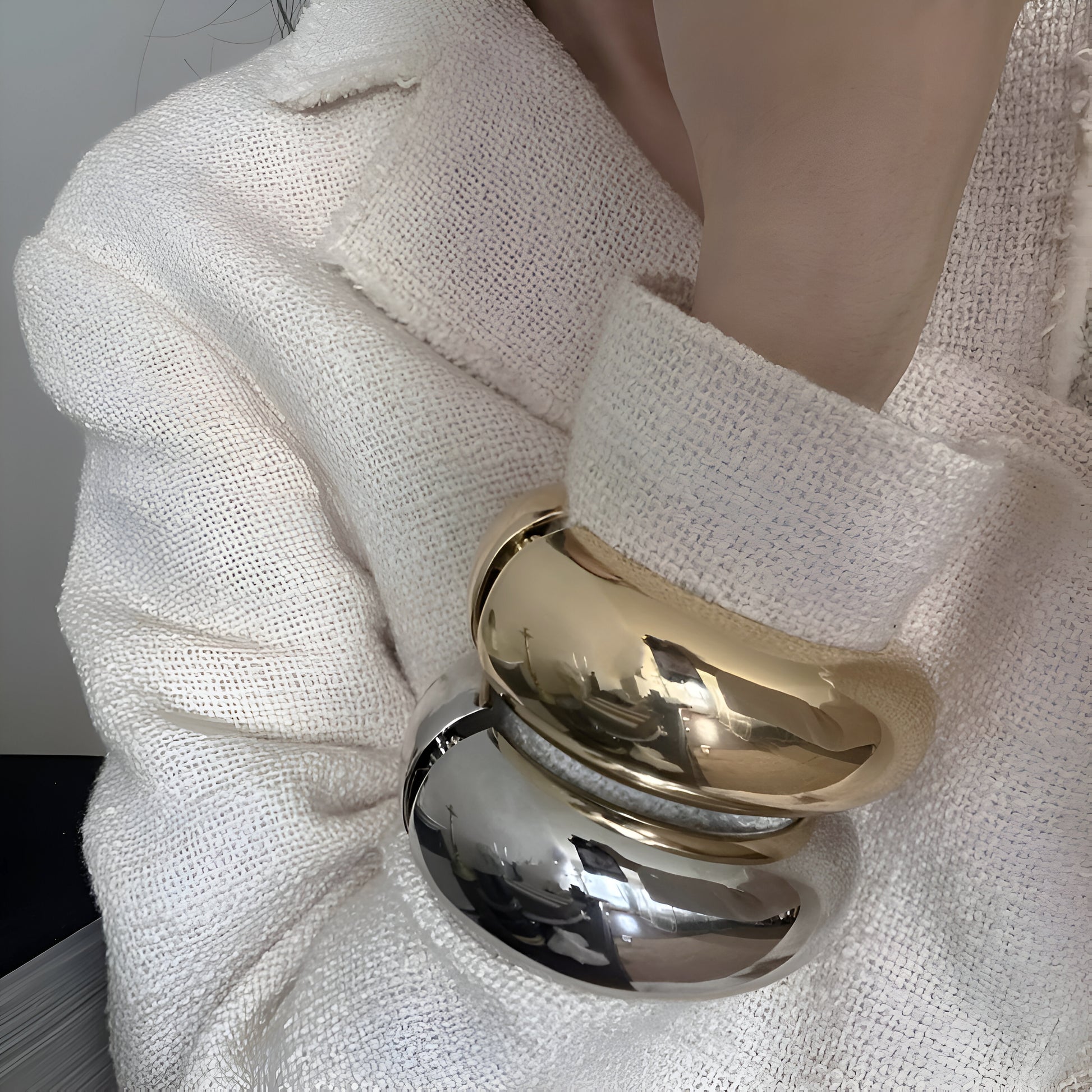 Turn heads with the Bold Dome Hinge Bangle Bracelet, a sleek statement cuff that blends minimalism and elegance with bold 2000s energy. This sculptural piece features a smooth dome silhouette and a discreet hinge clasp for easy wear. Whether you choose high-polish silver or rich gold, it adds a classy yet modern touch to any outfit. Perfect for pairing with tailored looks or monochrome outfits, this bracelet channels both Y2K sophistication and contemporary chic.
