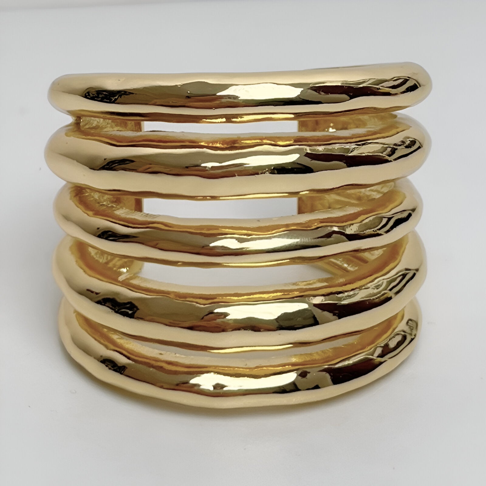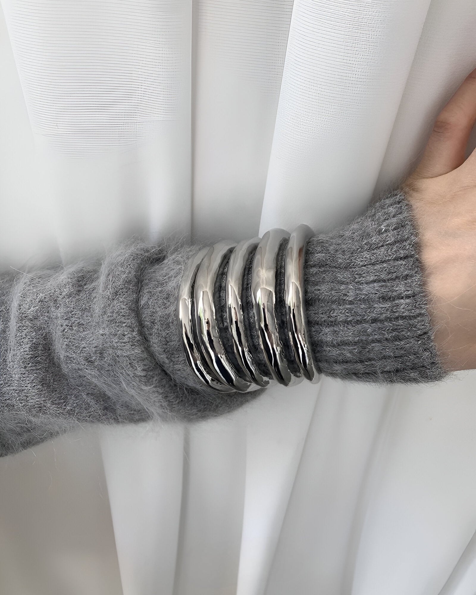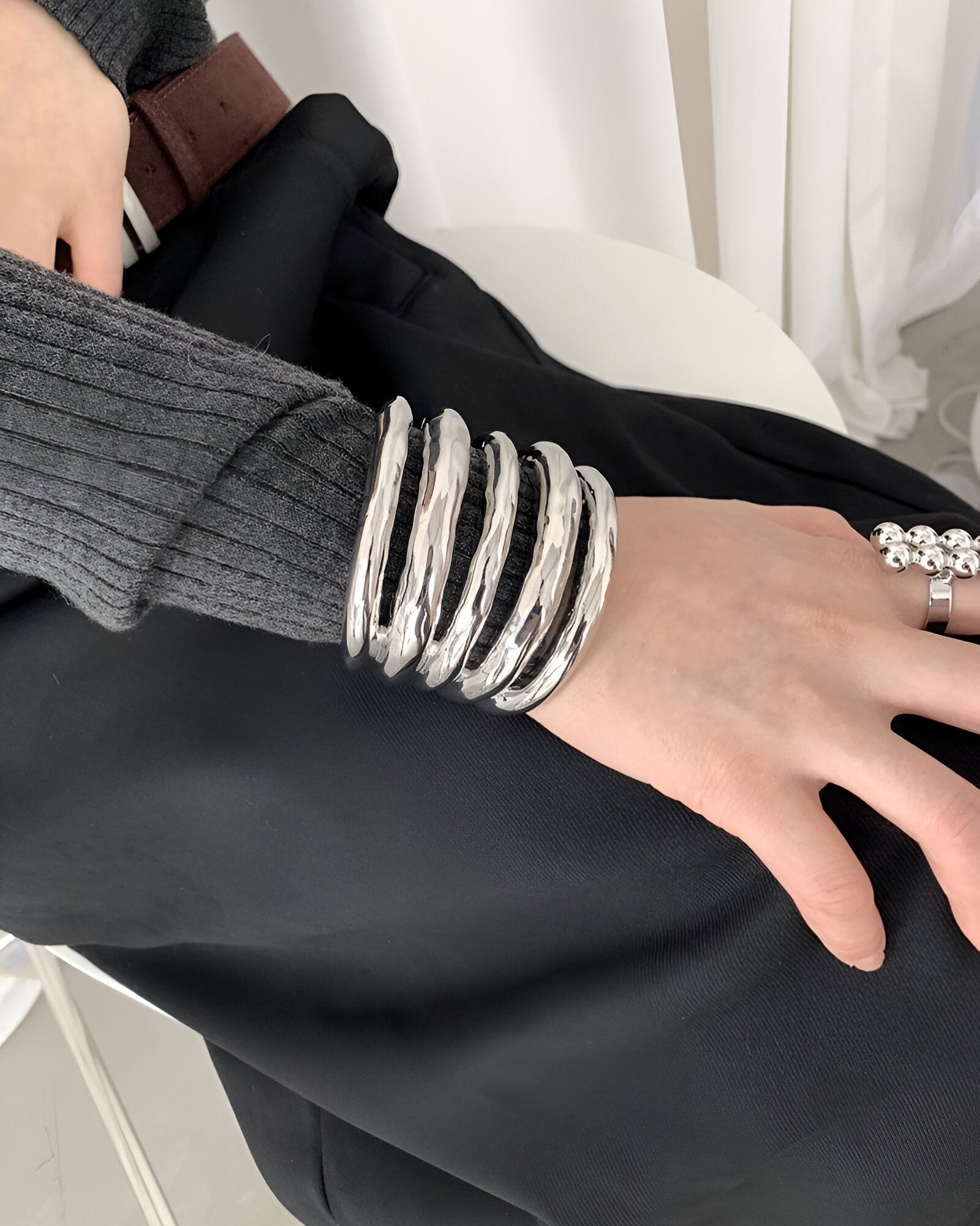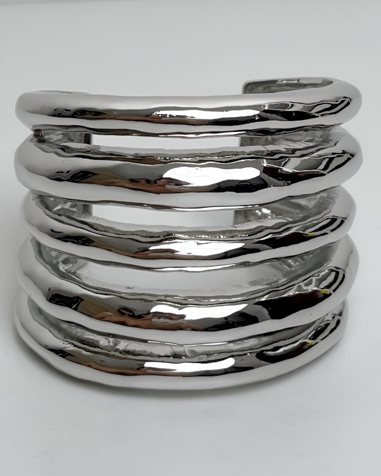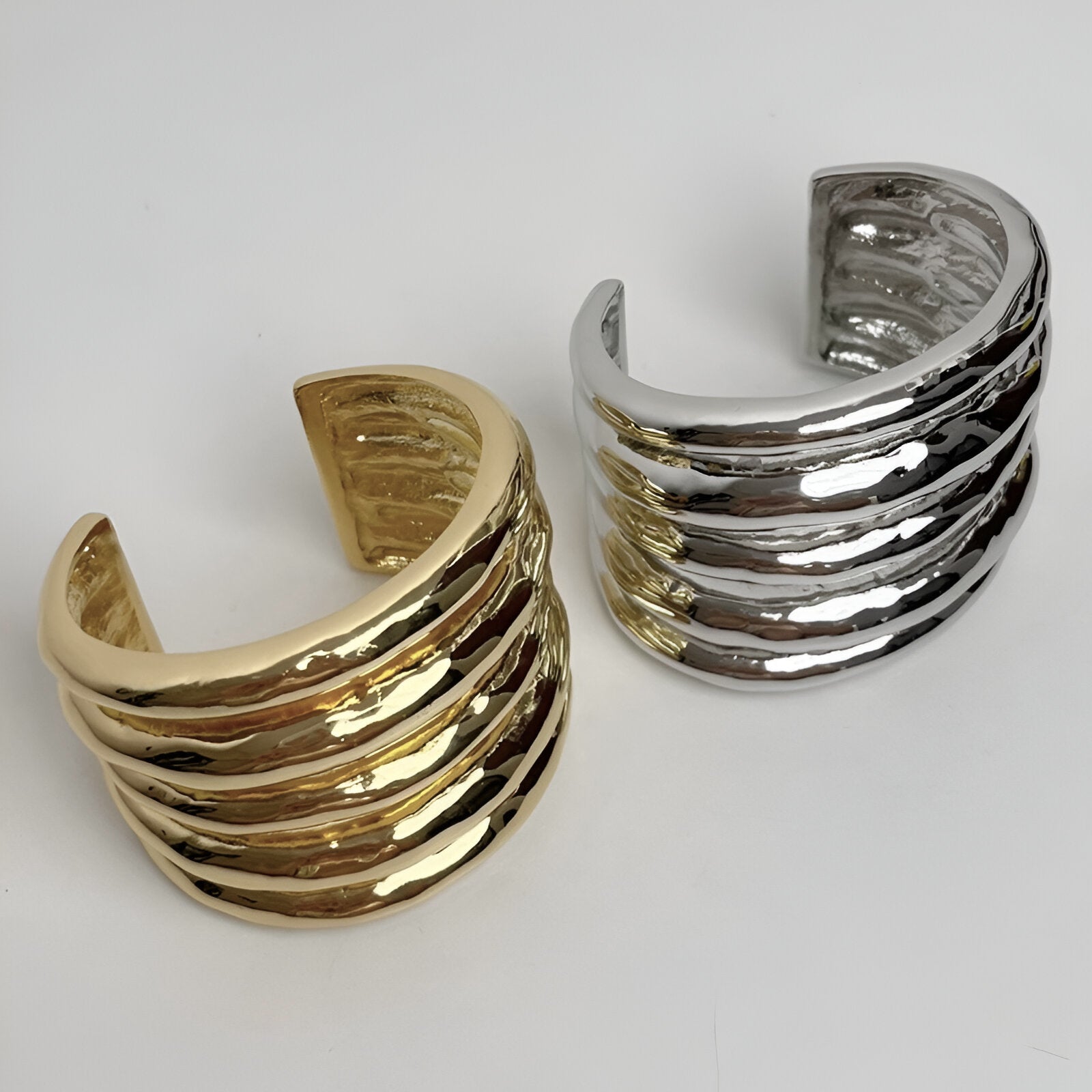 Make a bold statement with this Chunky Rippled Metal Cuff Bracelet, designed for lovers of Y2K, minimalistic, and indie sleaze aesthetics. Crafted from high-shine stainless steel, its oversized, sculpted form adds striking dimension to any look. The open design ensures a comfortable fit, while the choice of silver or gold tone lets you match your personal vibe. Perfect for stacking or solo wear, this cuff elevates everything from cozy knits to sleek streetwear with a futuristic twist.