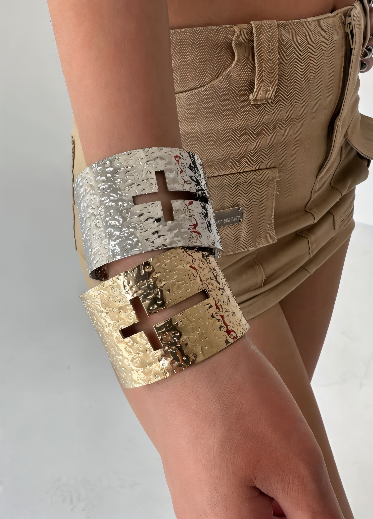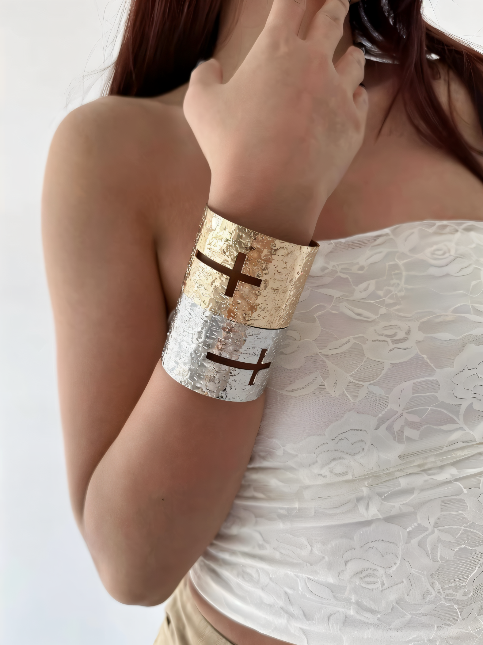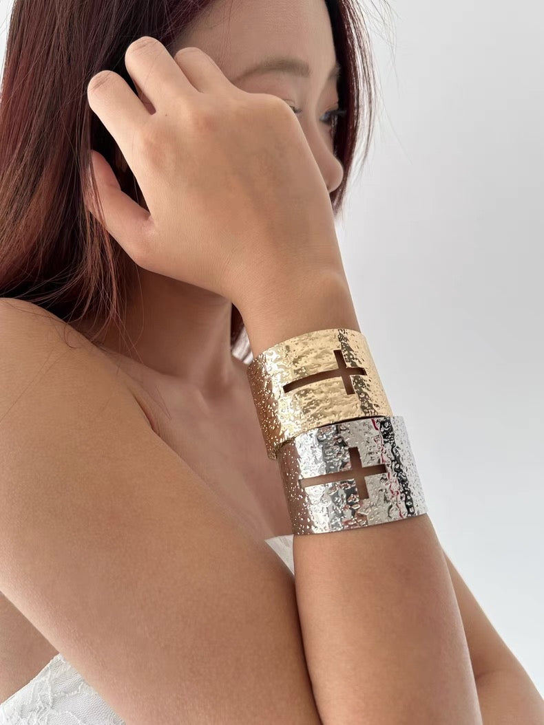This Cross Cutout Cuff Bracelet is a bold and edgy piece inspired by Y2K revival, indie sleaze, and spiritual symbolism. Featuring a high-shine stainless steel base with a two-tone gold and silver finish, it’s defined by dramatic cross cutouts and a textured surface that reflects light with a rugged yet refined edge. The wide cuff silhouette adds a statement-making, almost armor-like feel, ideal for styling with layered lace, sheer fabrics, or streetwear. A striking piece for those who blend grunge, alt-fashion, and early 2000s glam.