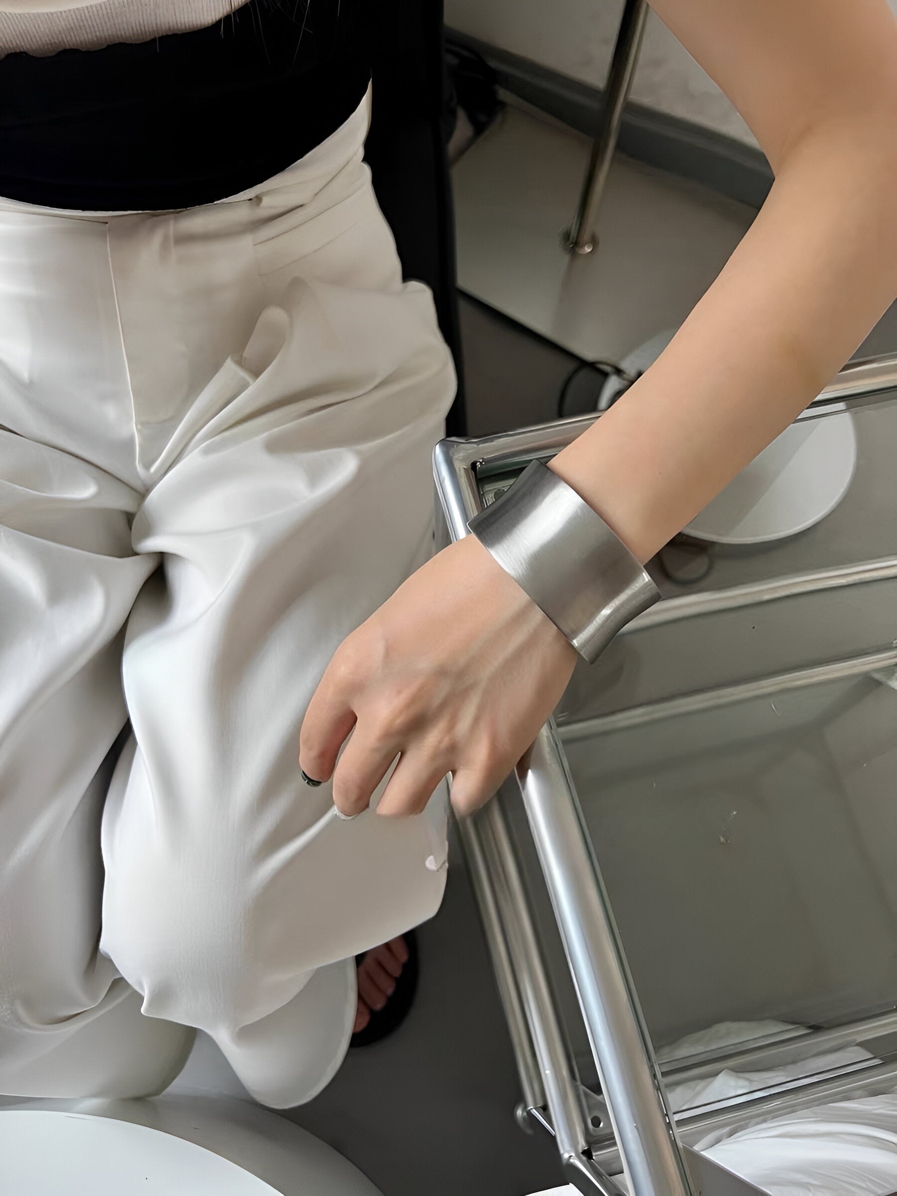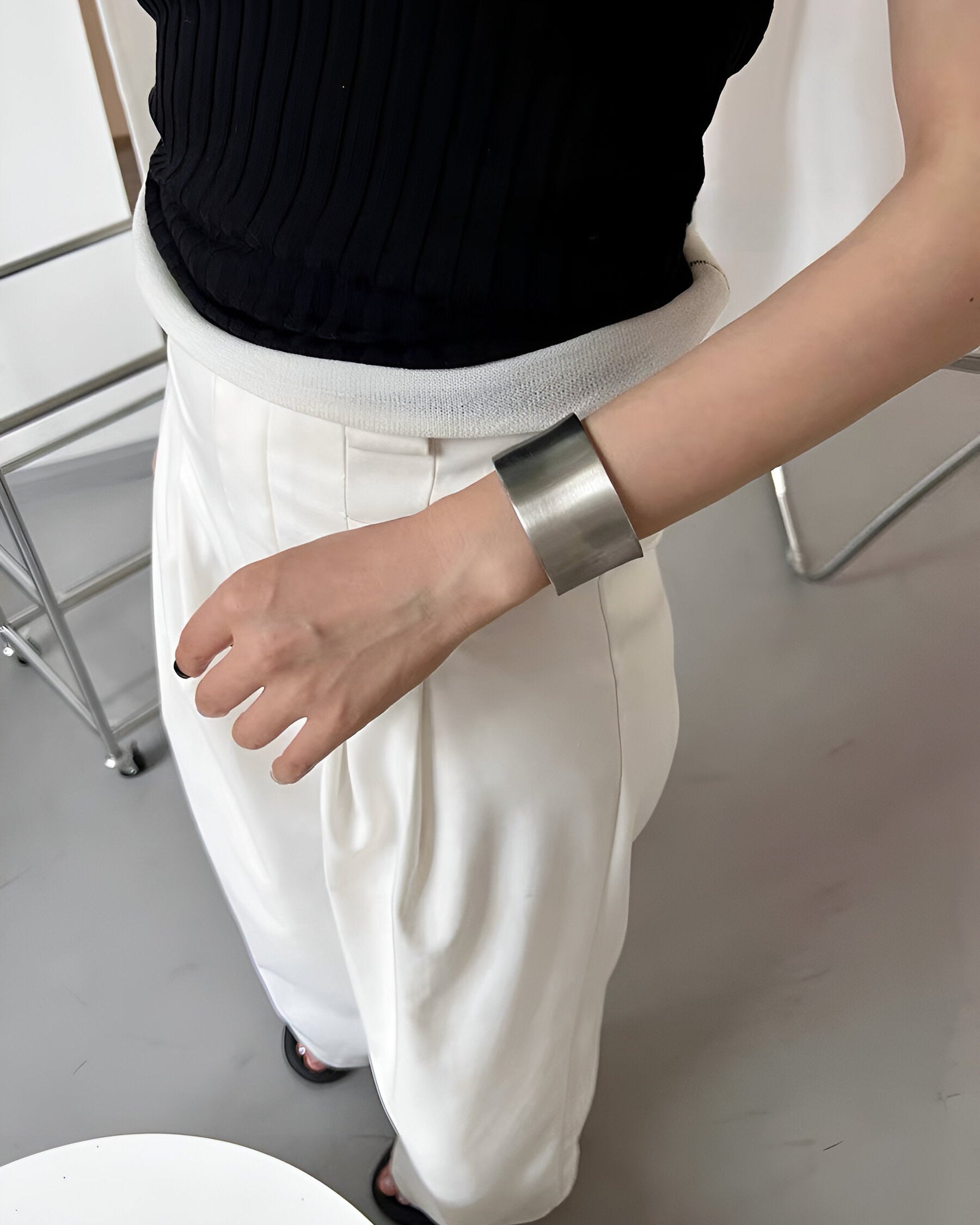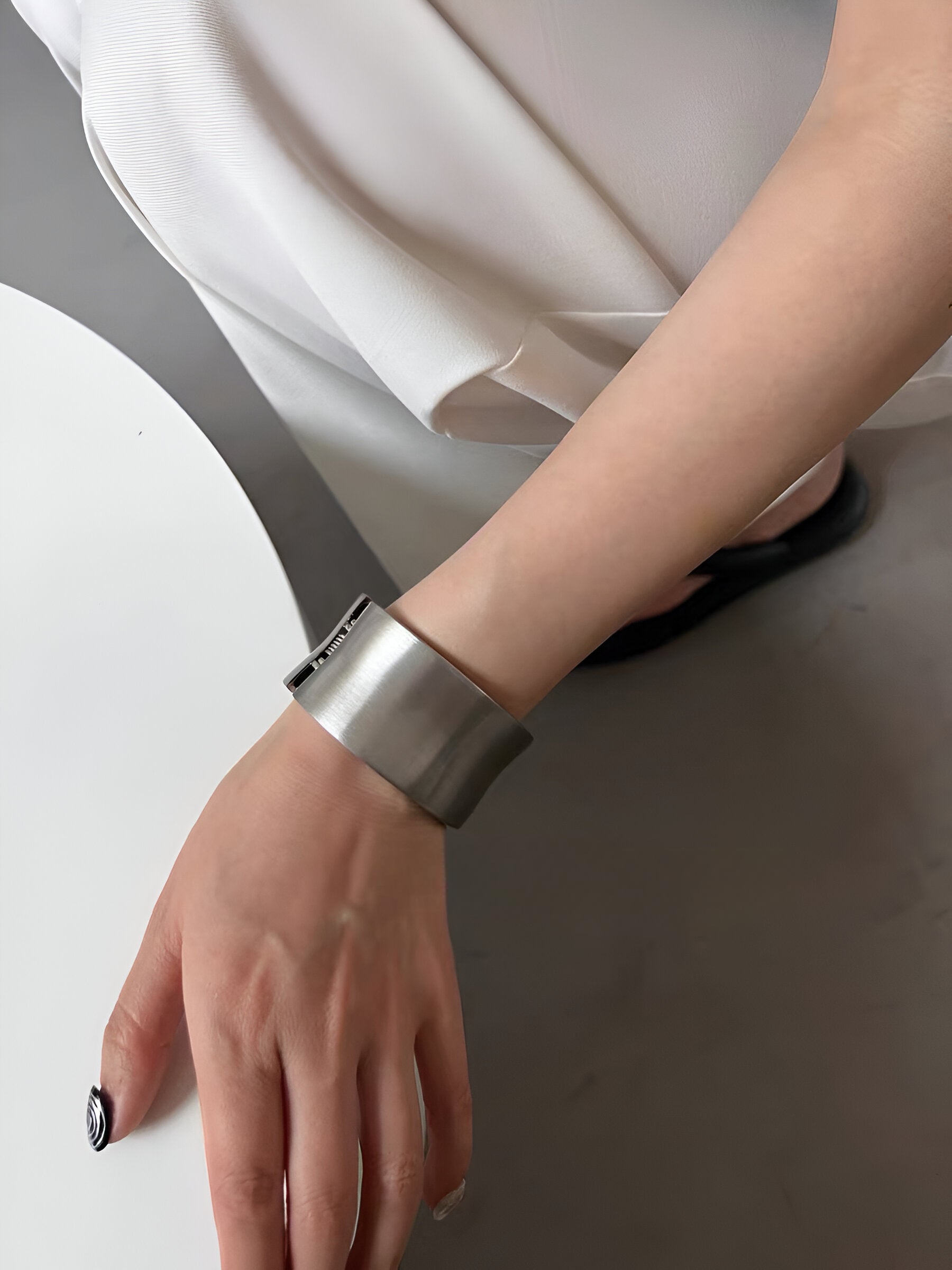 A bold expression of form and restraint, this minimalistic open cuff channels brutalist architecture through clean geometry and raw texture. Crafted in brushed stainless steel, its wide, weighty silhouette wraps the wrist with futuristic intensity. Designed for unapologetic styling—from monochrome tailoring to deconstructed streetwear.