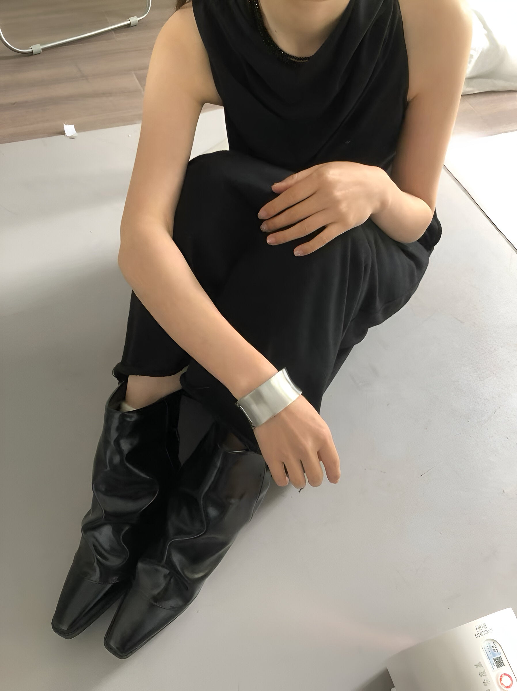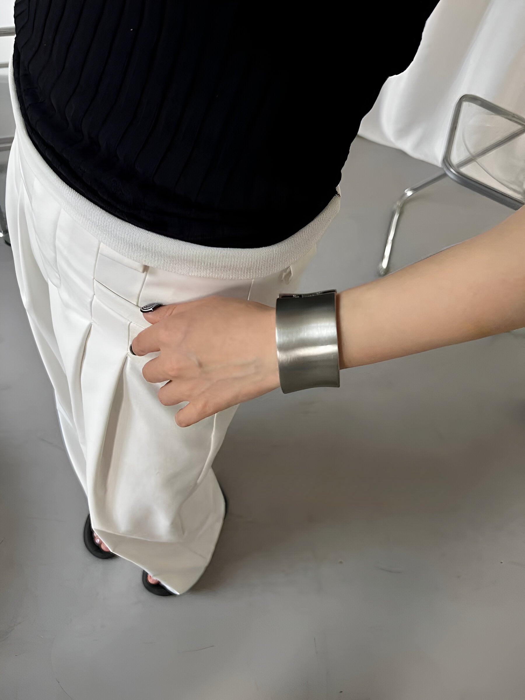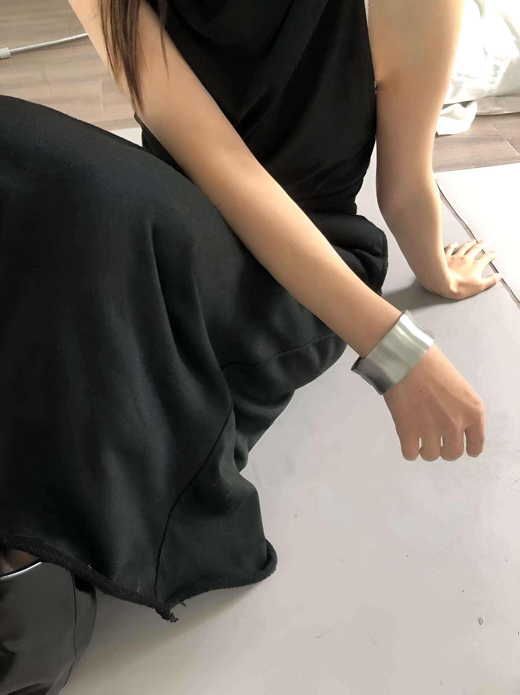 A bold expression of form and restraint, this minimalistic open cuff channels brutalist architecture through clean geometry and raw texture. Crafted in brushed stainless steel, its wide, weighty silhouette wraps the wrist with futuristic intensity. Designed for unapologetic styling—from monochrome tailoring to deconstructed streetwear.