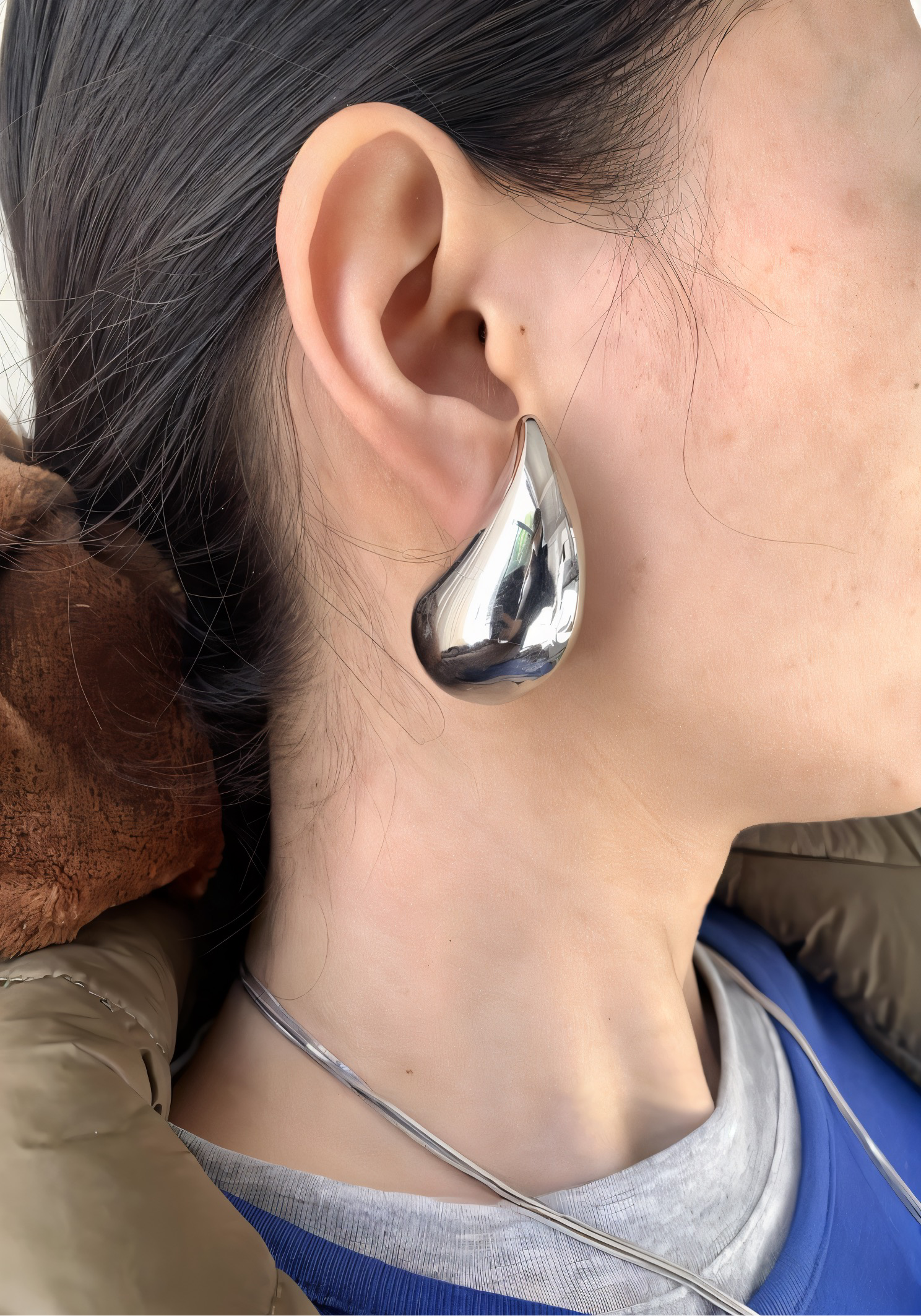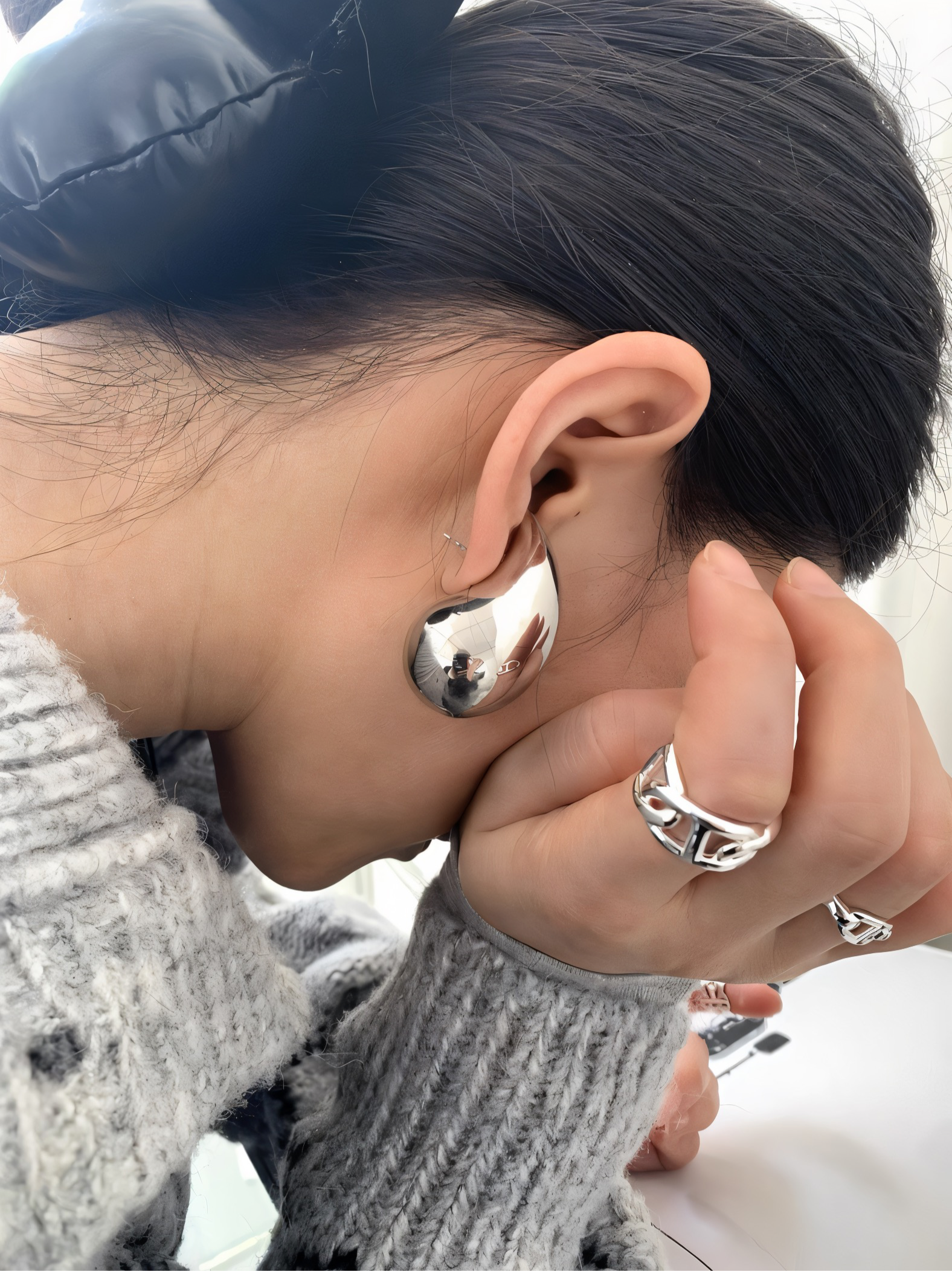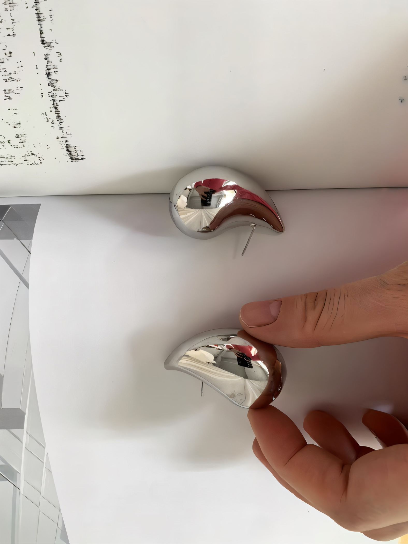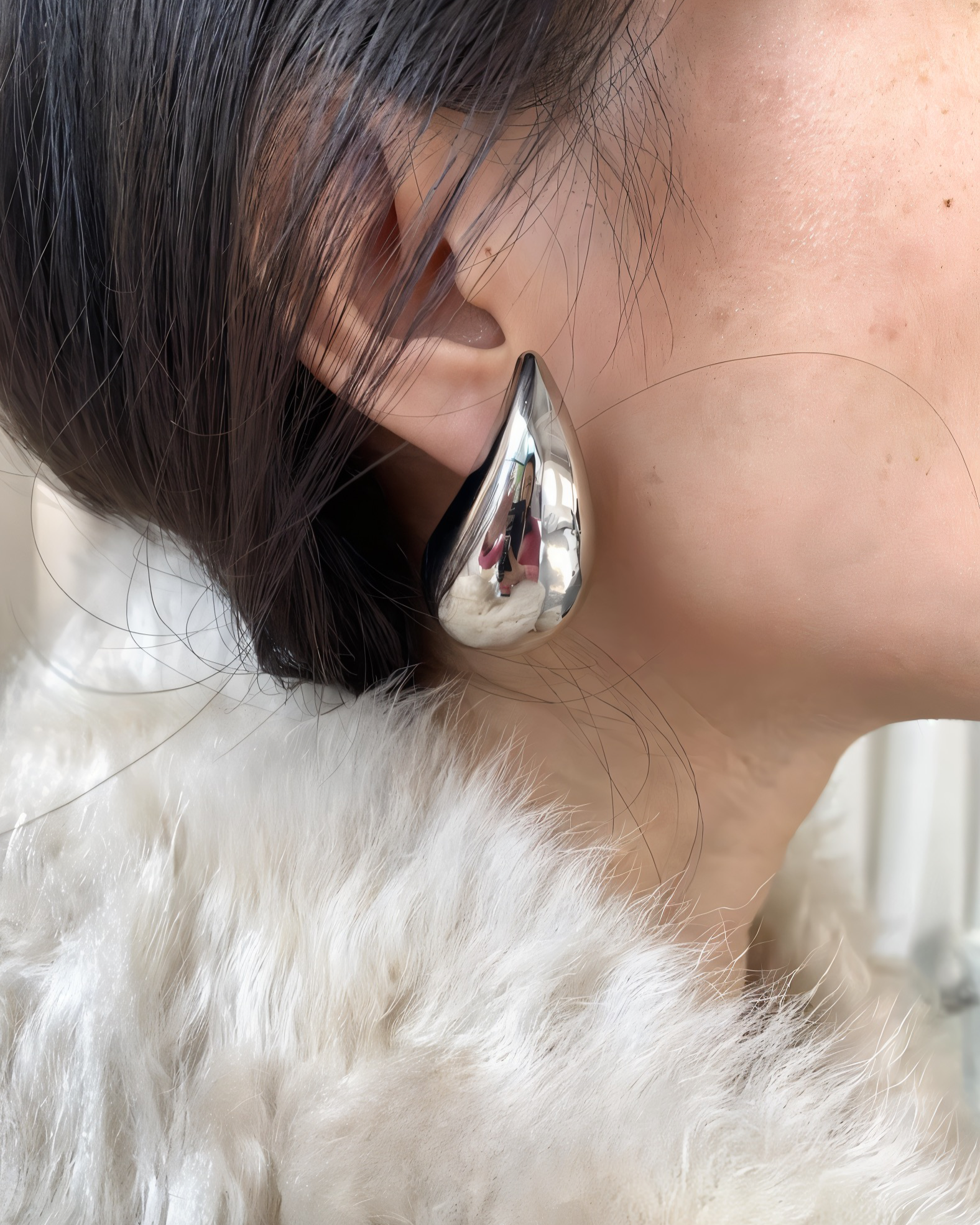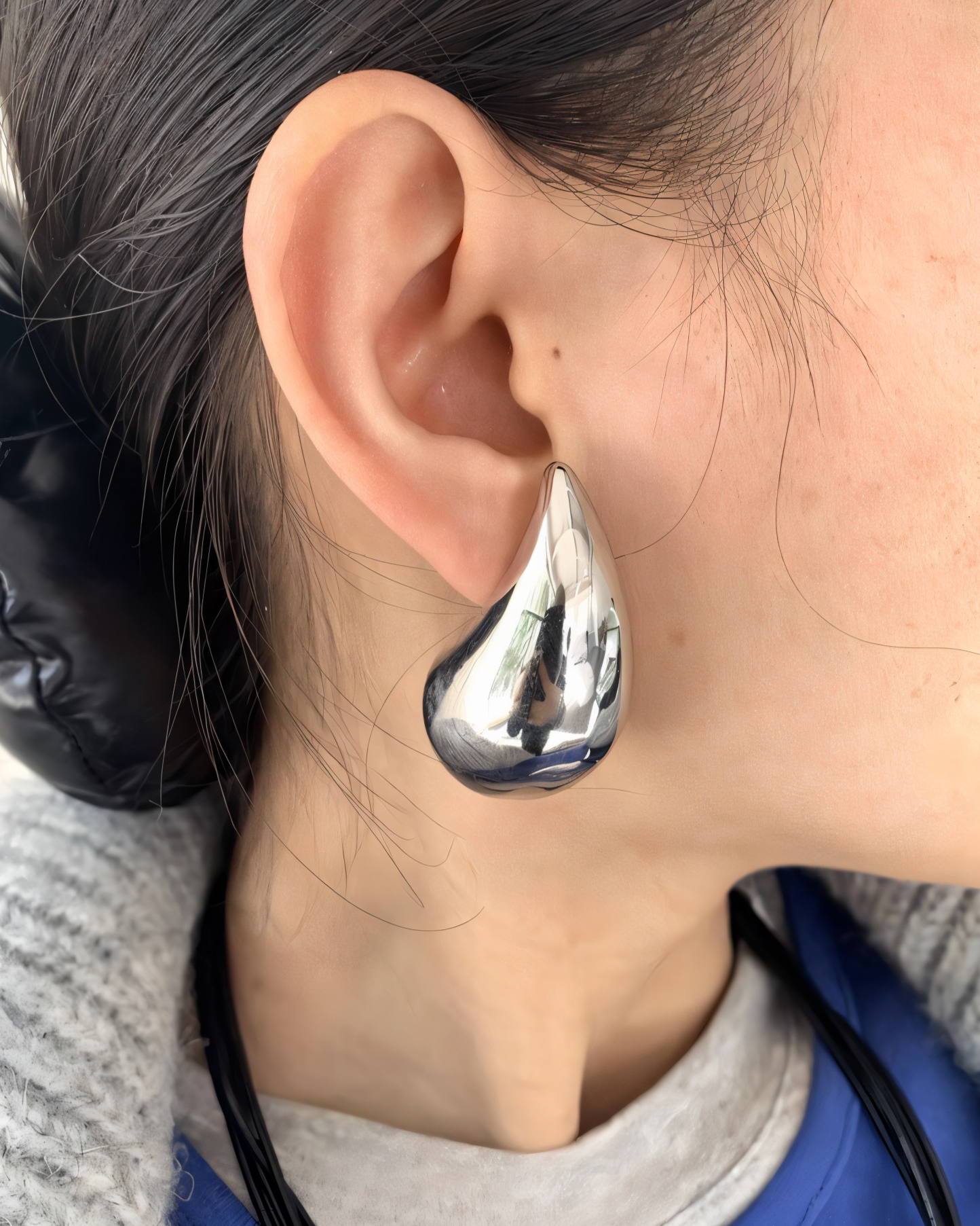Crafted with a sleek teardrop silhouette, these polished chrome earrings reflect light like liquid metal. The stainless steel form hugs the earlobe with a bold yet minimal presence, channeling futuristic energy with sculptural precision. Ideal for styling with Y2K layers, sharp tailoring, or everyday grunge, this pair brings statement shine to any look without overwhelming it. Designed for those who appreciate clean lines and unconventional curves, modern sculptural design, indie sleaze accessories, silver droplet studs