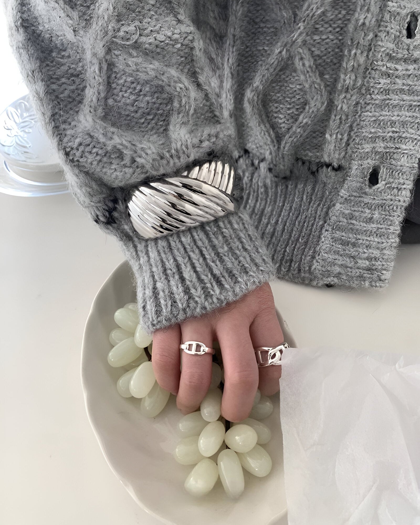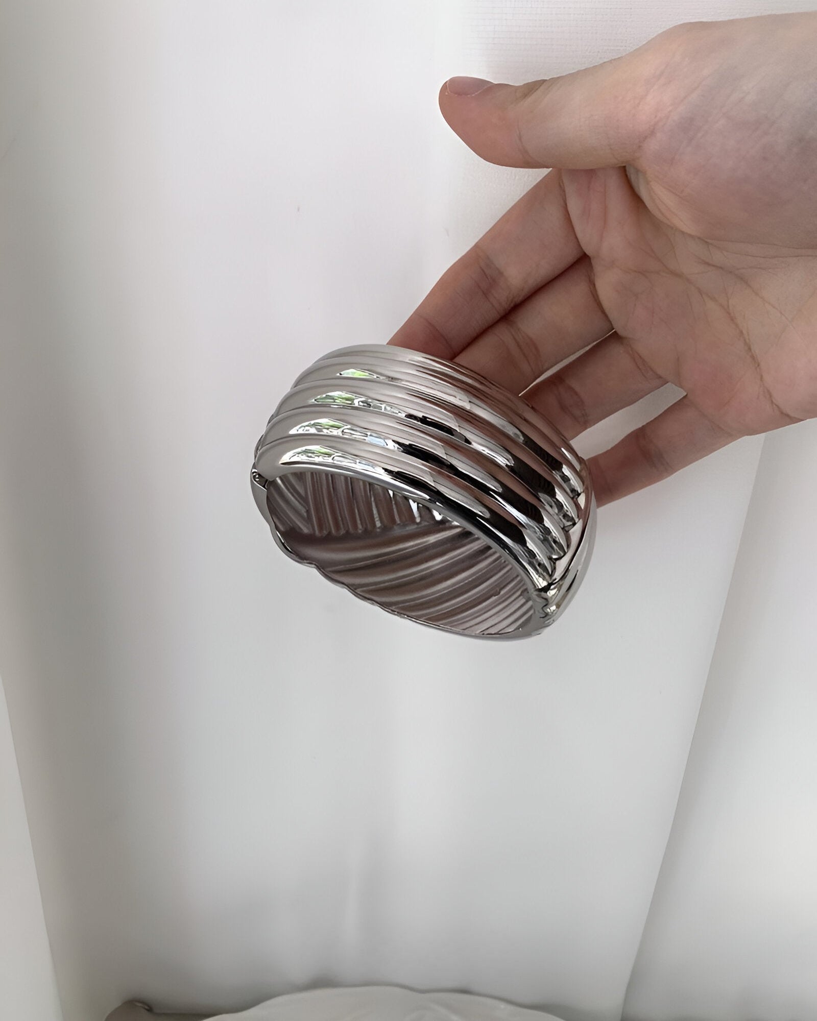 This Ridged Silver Cuff Bracelet is a bold take on modern minimalism. With its sculptural ridged surface and chunky dome profile, it adds high-impact shine to any outfit. Made from durable stainless steel, the polished finish and hinged clasp create a sleek and comfortable fit. Ideal for layering with other metallic accessories or worn solo as a standout piece, this bracelet blends Y2K-inspired futurism with clean, contemporary elegance.