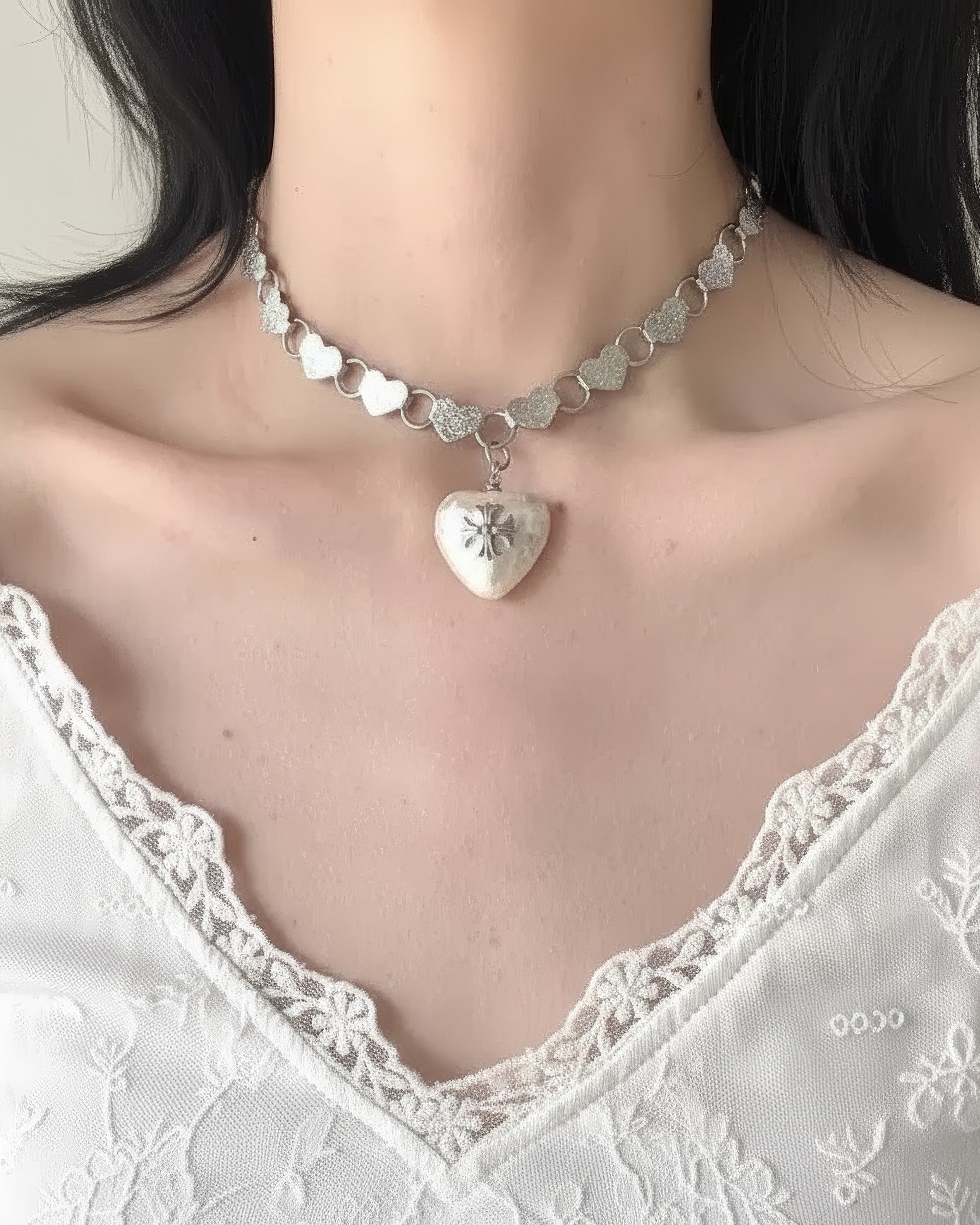 Material: Stainless steel Style: Description: A shimmering row of textured hearts frames the neckline in this ultra-feminine stainless steel choker. At its center, a sculpted puffy heart pendant dangles delicately, embossed with a tiny floral motif for an added hint of innocence. The 45cm length rests gently across the collarbones, making it ideal for layering or as a standalone statement piece. Romantic and polished, this piece captures a dreamy coquette aesthetic with a playful early-2000s touch.